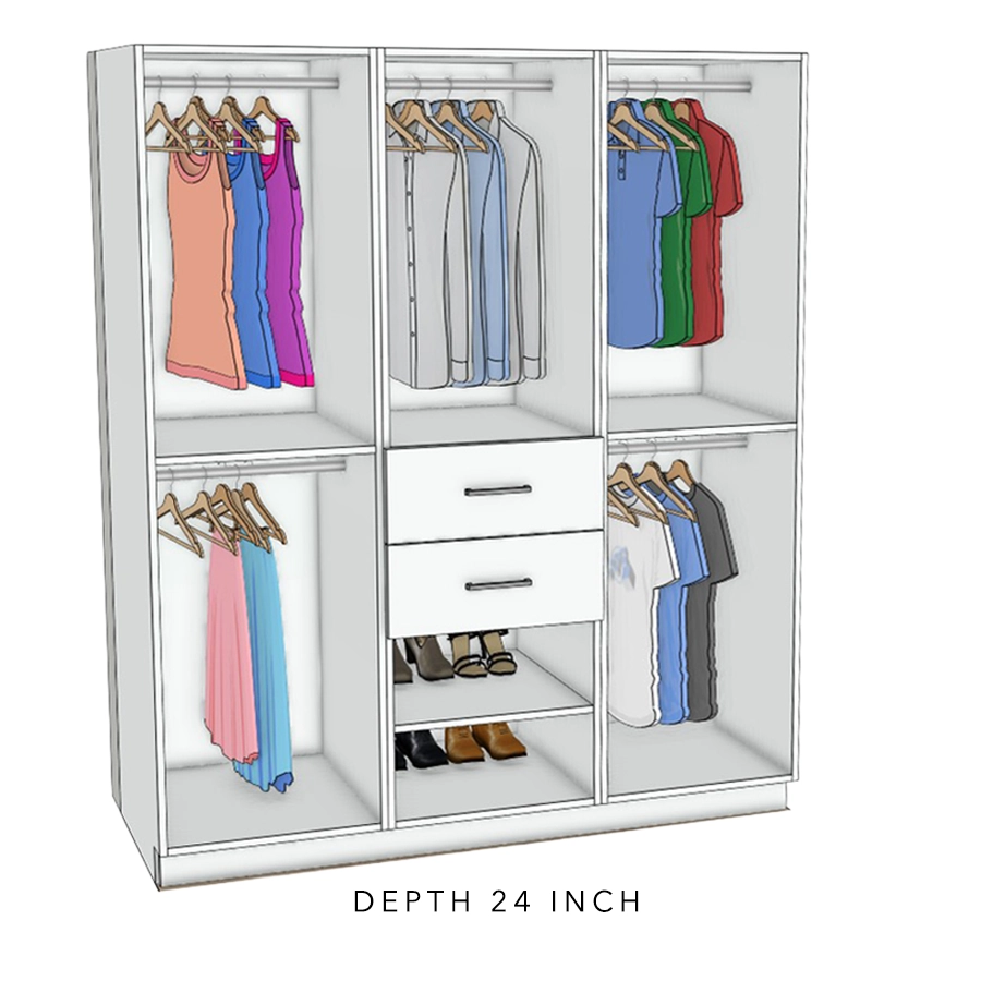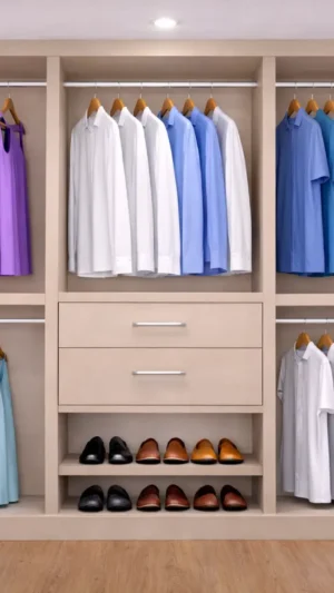 This closet system combines contemporary design with practical organization. Adjustable shelving, spacious hanging sections, and soft‑close drawers help keep clothing and accessories organized and easy to access.